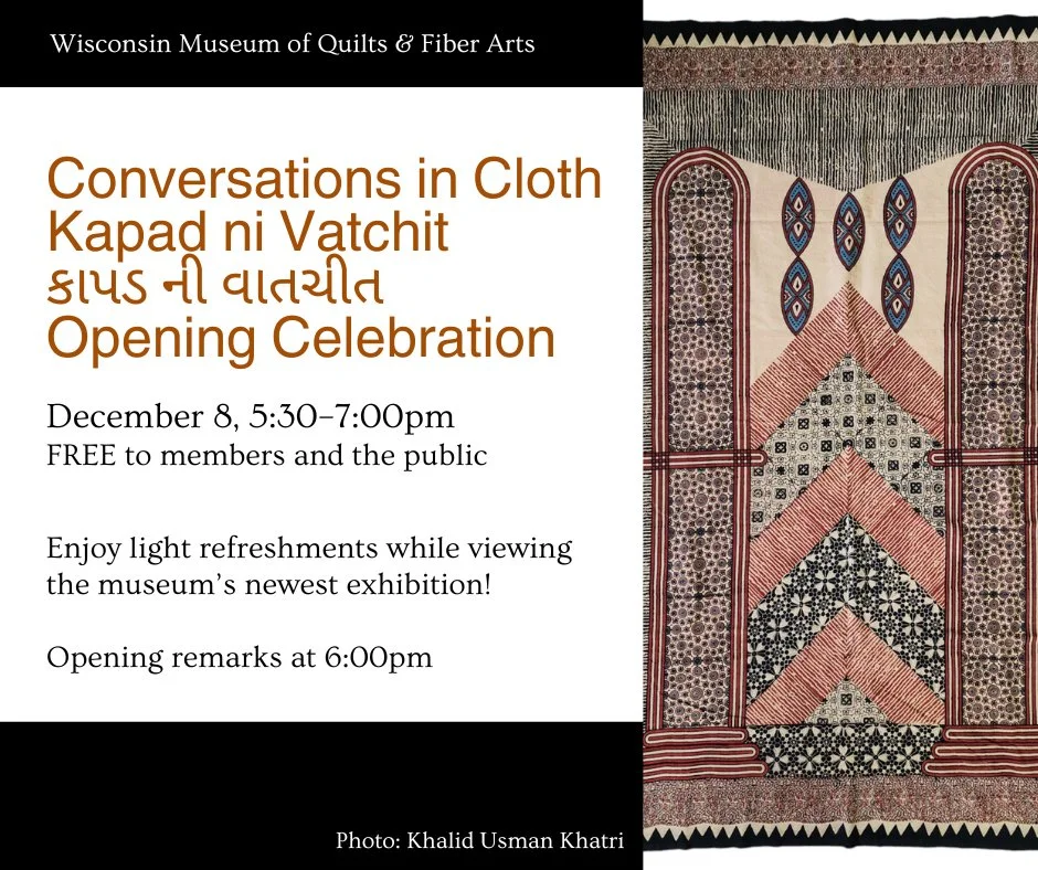 Join us on Friday, December 8, from 5:30–7:00pm, for a night celebrating the opening of the exhibition Conversations in Cloth / Kapad ni Vatchit / કાપડ ની વાતચીત.